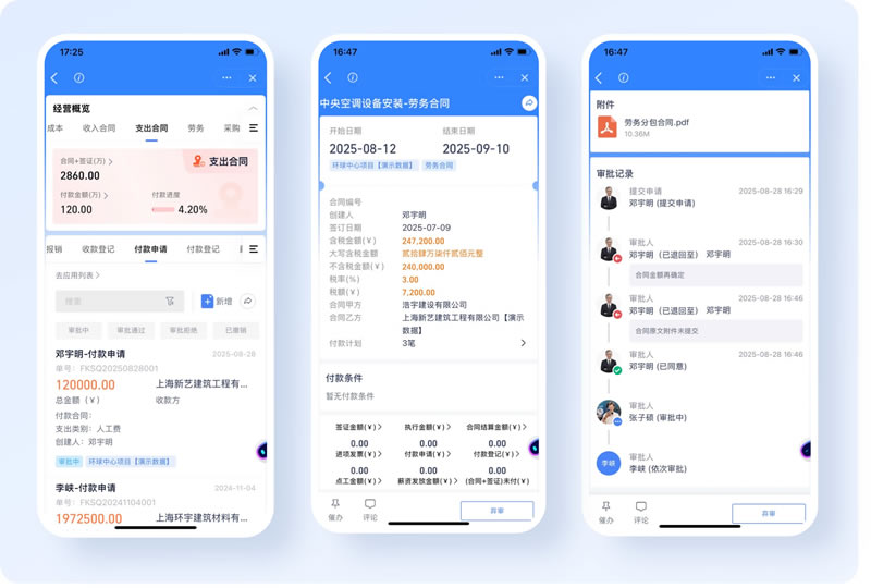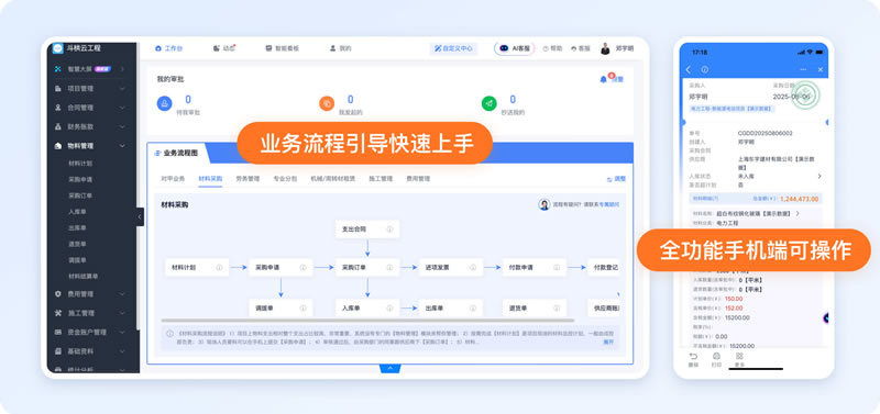 二.项目全流程无纸化办公:统一规范无死角 全流程无纸化:项目所有业务单据(合同审批、付款申请、材料入库单等)均在线上提交,手机拍照即可上传附件,搜索 “2025年9月材料付款” 10 秒调出,无需再翻纸质档案
