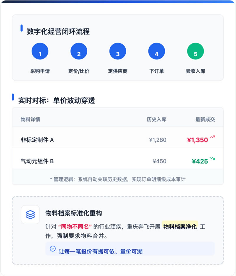 对于承接长安汽车、东方电器等顶尖企业工程改造项目的重庆奔飞而言,成本管控不仅是财务命题,更是对业主负责的信誉命题。非标物资品类冗杂,价格波动剧烈,重庆奔飞通过数字化手段实现了极高颗粒度的治理。